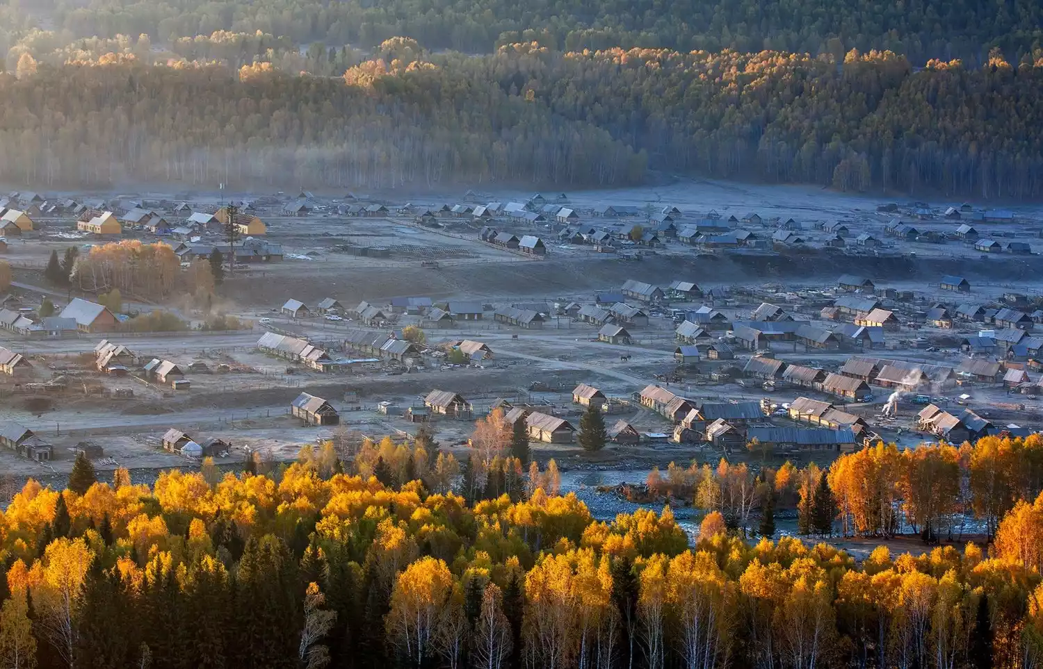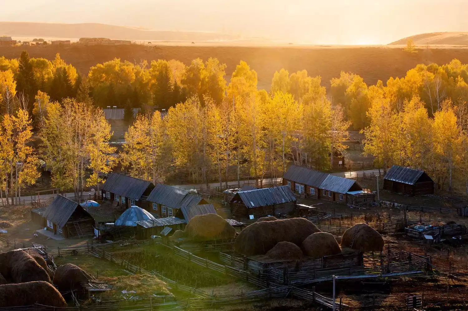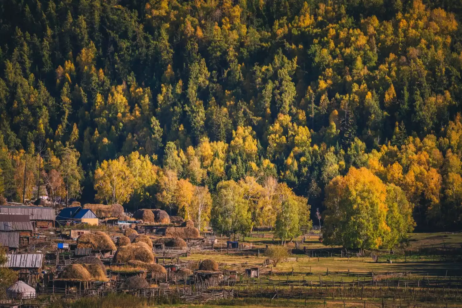 This is a small village inhabited by both Kazakhs and Tuvans. All the houses in Hemu are simple log cabins scattered throughout the mountain valley. In autumn, the birch trees on the slopes flanking the village turn a brilliant golden hue, while the mountaintops begin to accumulate snow, creating a fairytale-like scene.