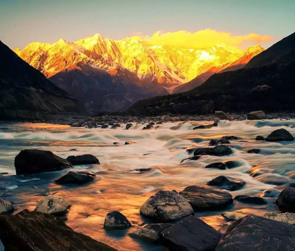 One of the four sacred mountains in Tibet, known as the "Second Shambhala," the mountain commands immense local prestige. It is the first snow-capped mountain traversed on the Sichuan-Tibet Tea-Horse Road and is ranked among China's ten most beautiful snow-capped mountains. A pristine, pure-white rectangular pyramid, the Yala Snow Mountain is nicknamed the "White Yak of the East." The sun's golden glow is truly breathtaking. Morning light pierces through layers of mist at its summit, shrouding the lotus-shaped mountain in golden light, giving it a rose-gold sheen that is breathtakingly beautiful.