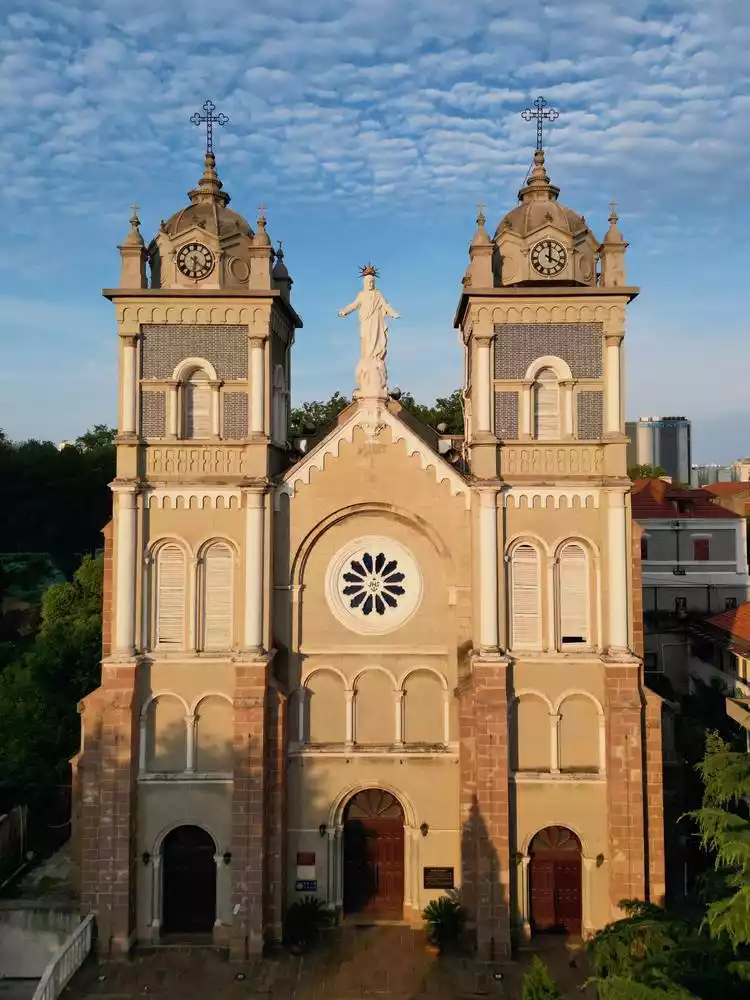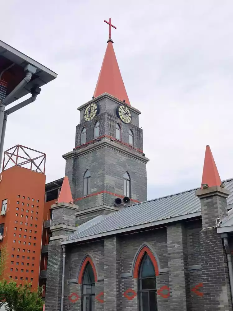 This was the most surprising spot. We were walking north from Jihe Square at the southern end of Binjiang Park, and just as we were approaching, we saw this building from afar. This was the church we wanted to see. The full name of the Wuhu St. Joseph's Cathedral is a large Romanesque Catholic church. Designed and supervised by the French in 1887, it is a mixed brick, wood and stone structure.