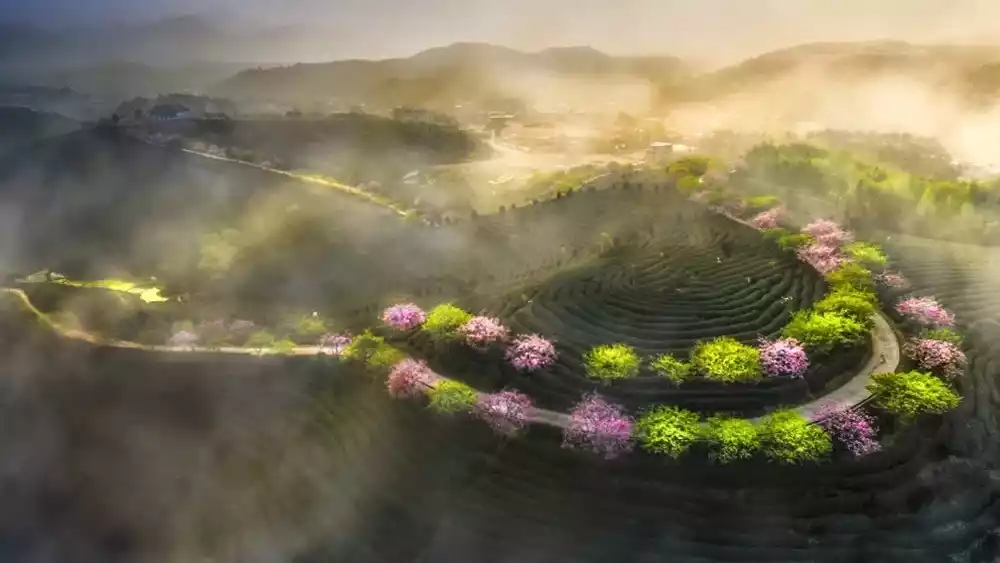 🌟Highlights: There are large areas of high mountain organic tea and nearly 100,000 cherry trees. Every spring, the cherry blossoms in the tea garden bloom, forming clusters of snow-white and bright red cherry blossoms.