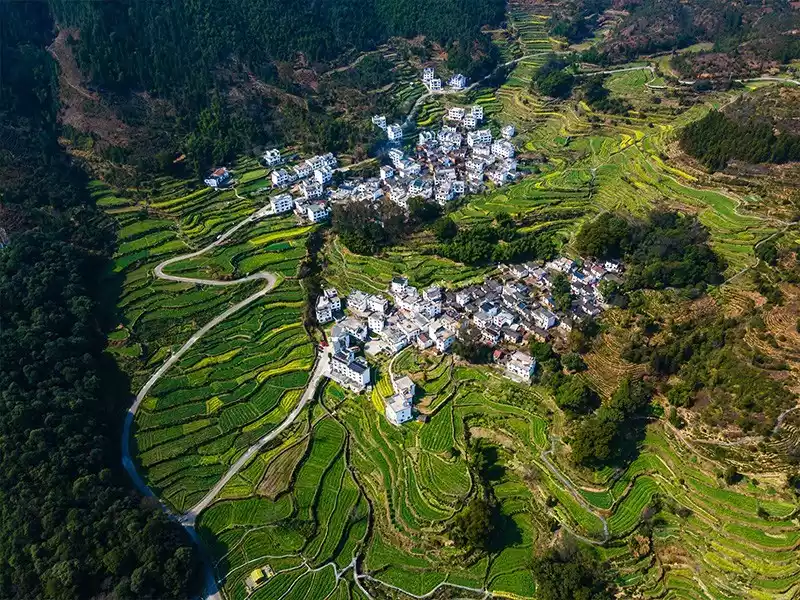 🌟Highlights: Nearly 10,000 mu of terraced rapeseed flowers complement the white-walled and black-tiled houses. Wuyuan Huangling is known as one of the "Top Ten Most Beautiful Terraced Fields in the World"