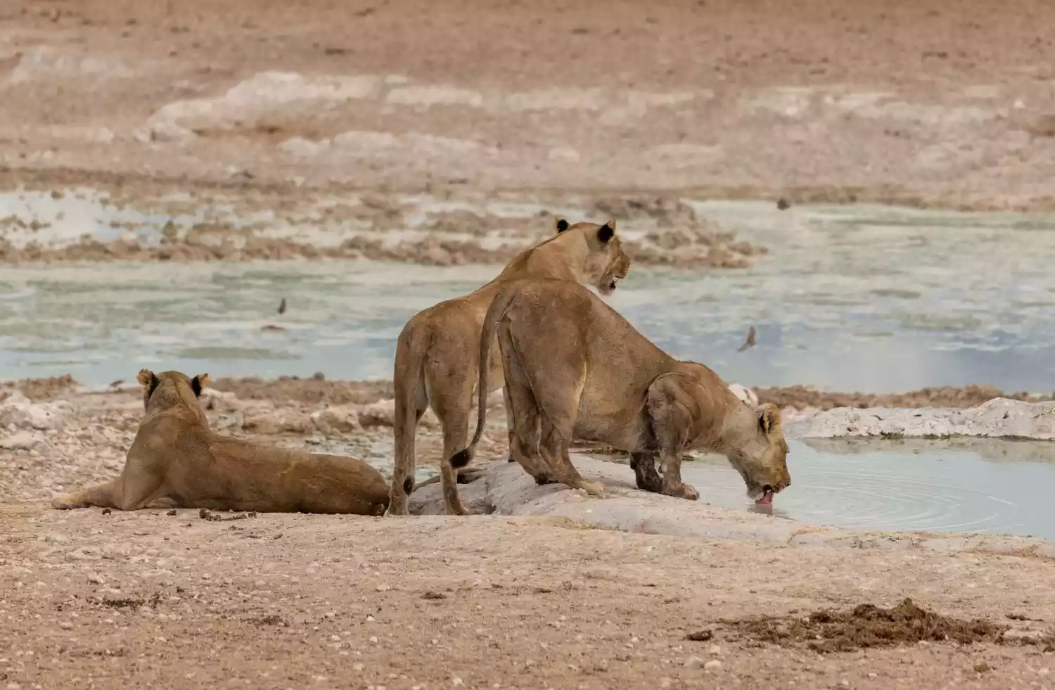 Throughout Etosha National Park, there are numerous waterholes of varying sizes. Watching animals here is simple: simply follow the waterholes and wait for them to arrive. You'll notice that each animal drinks differently, at different times.