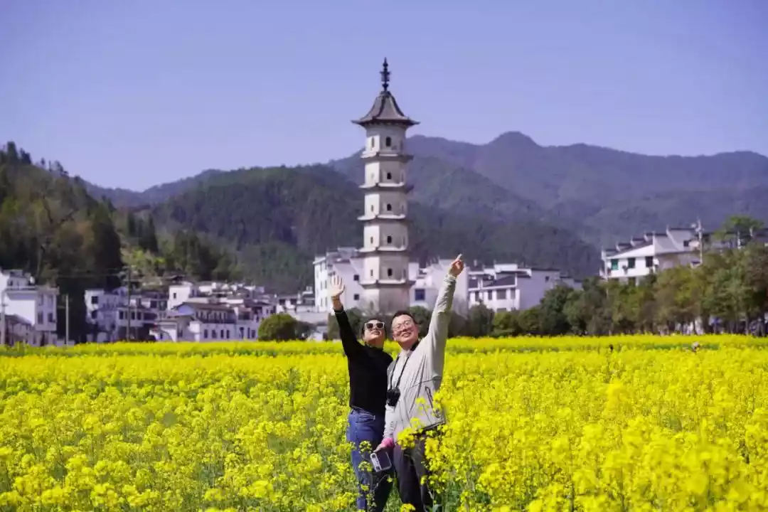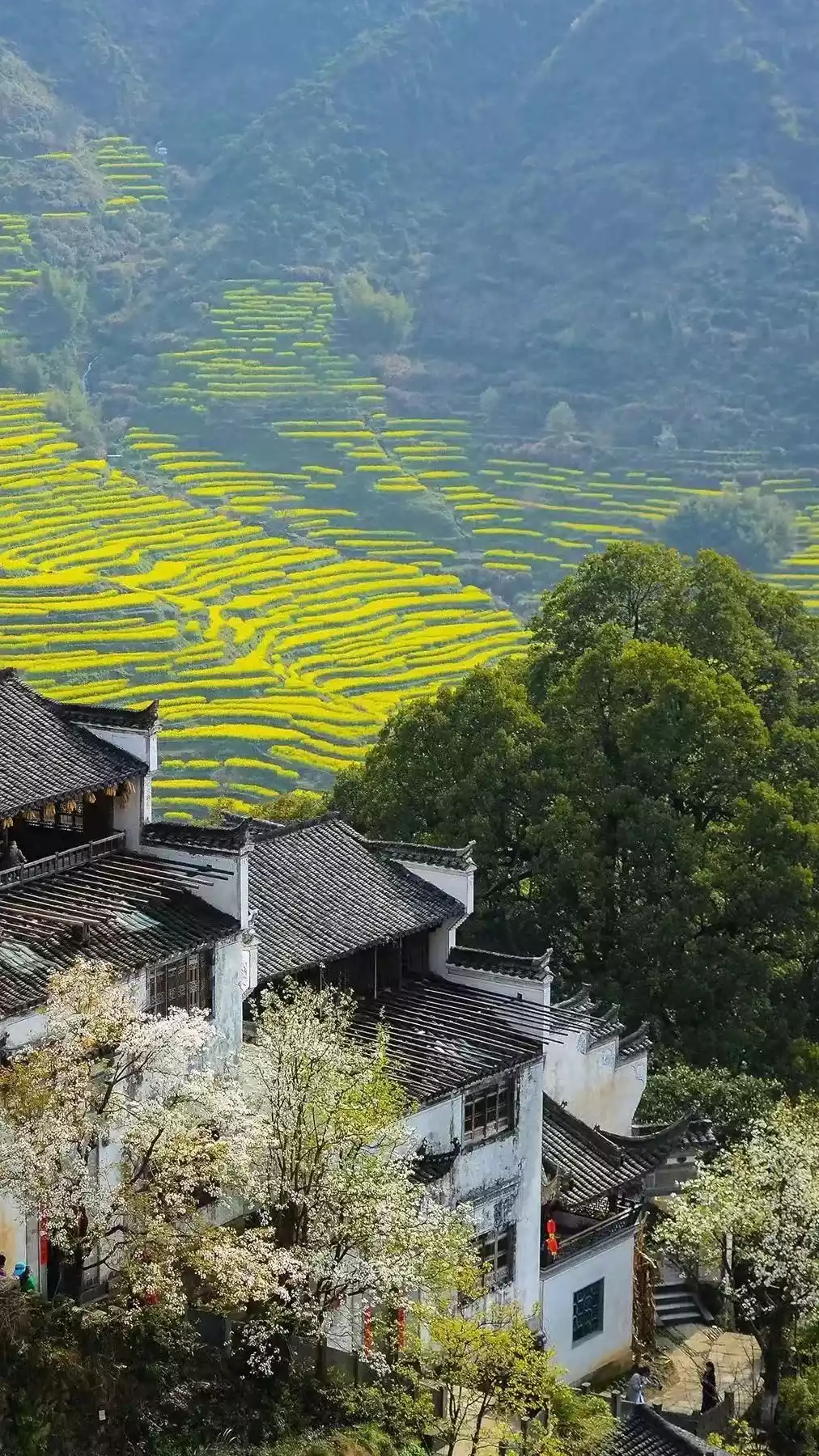 Ancient Huizhou, a place whose very name suggests a beautiful ink painting, boasts breathtaking beauty in both spring and autumn. Spring is especially vibrant, with golden rapeseed blossoms, pink peach blossoms, and snow-white pear blossoms, all set against the backdrop of the white walls and black tiles of Huizhou-style architecture.