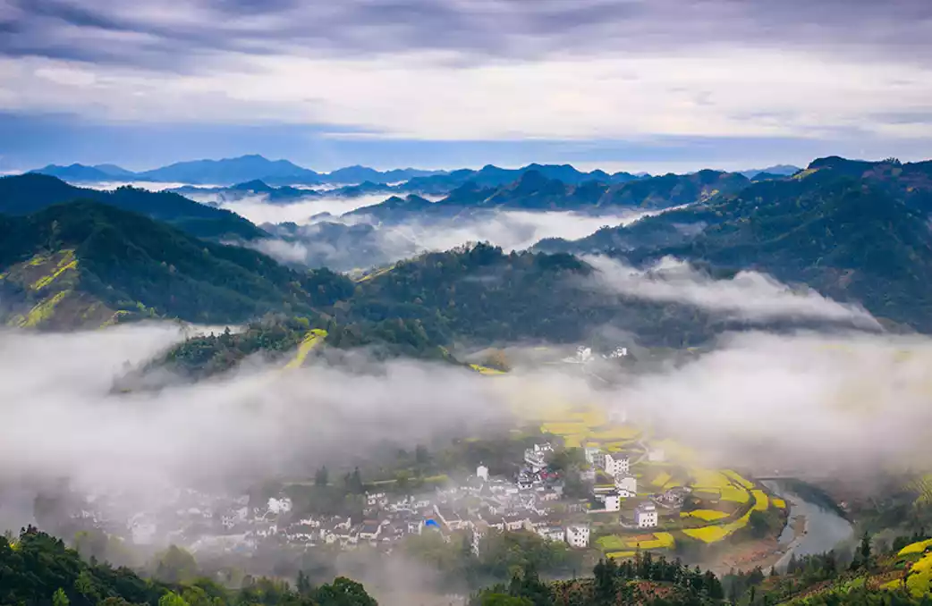 Hongcun and Lucun are the representatives of Huizhou's ancient villages. In spring, the Nanhu Lake in Hongcun is in the early morning, with rippling blue water and rolling clouds, as if time has stood still here. The rapeseed flowers in Lucun are in the sea, with golden petals swaying in the breeze, interwoven with the light clouds in the distant mountains, creating a beautiful pastoral scenery.