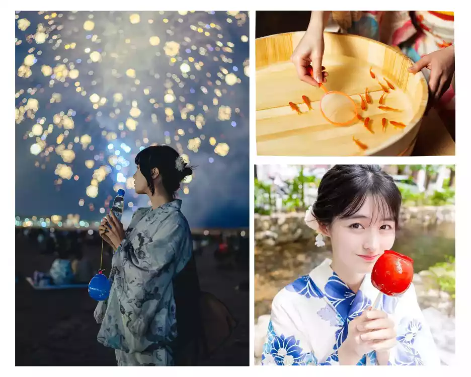 These famous scenes are inspired by Japan's most captivating summer festivals! Wearing a yukata, scooping goldfish, eating candy apples, and enjoying the fireworks display—