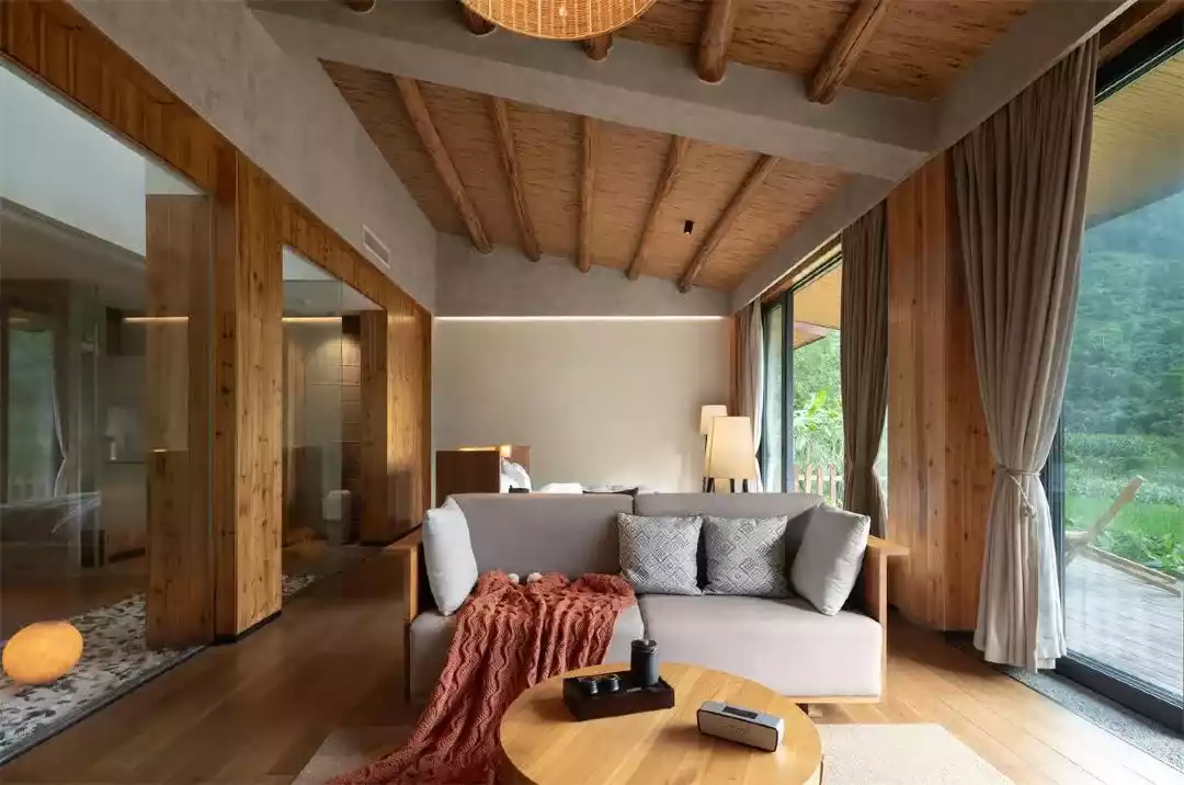 Puxu Huawu Mountain and River Boutique Resort B&B (Qianxi): A rustic luxury retreat on the banks of the Wujiang River. Instagram-style semi-glass rooms face the landscape directly, and the rooftop terrace offers panoramic views of the entire landscape. All-inclusive service is available, with fruit picking available from a 10-acre orchard. A swimming pool and music bar add to the romantic atmosphere.