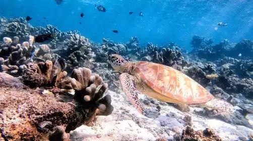 There are beautiful coral reefs. Snorkeling allows you to see many small fish swimming among the corals. If there is no tide, you can also go to the island and walk around the island.