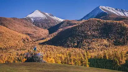 After breakfast, depart Baihaba by shuttle bus and travel along the scenic highway to Kanas, the "Backyard of God." Autumn here is like a palette of colors, with leaves gradually turning red, bright yellow, brown, and green. Against the backdrop of blue skies, white clouds, and towering snow-capped mountains, the scene resembles a fairyland on earth.