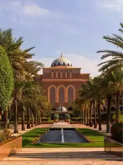 当阳光缓缓落下,划破天际,谢赫扎耶德清真寺的白色穹顶捕捉到第一缕阳光,散发出耀眼的光芒。大理石地面柔和地反射着这光芒,仿佛在天地之间筑起一道镜面般的连接。