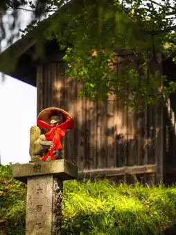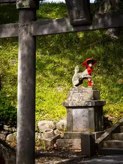 离开敦贺城之前,我经过台阶顶端的一座小神社。那里有一尊石狐狸雕像,围着红围巾,戴着小草帽。午后的阳光透过石像照射进来,鲜红的红毯在树影的映衬下格外醒目,给人一种温暖的感觉。