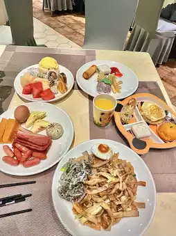 在老虎餐厅享用——包子、面条、面包、火腿、牛奶、果汁、炒米粉……吃得好饱!👍