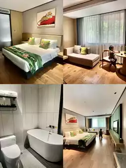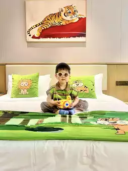我从去年就一直心心念念着这间老虎主题房间!从毯子、枕头、墙饰、牙刷、毛巾到浴袍,所有东西都是老虎主题的🐯。我还免费得到了一个老虎背包🎒,我家孩子爱不释手,一直背着它🤣。楼下,我们近距离看到了真正的老虎😍。我家孩子隔着玻璃追着它们跑了半个小时😂。