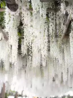 这里还有一条80米长的白色紫藤隧道,一株高达1.8米的紫藤花簇,散发着优雅香气的重瓣紫藤