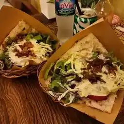 我们点了“烤马苏里拉奶酪布鲁斯凯塔”、“牛肉烤肉串”和“鸡肉烤肉串”。分量真的超大,我都惊呆了。可以拿图片里的水瓶跟它比比看,就能大概了解它有多大了……我们点的是普通份。他们说大份的单手拿着吃有点费劲。肉和蔬菜都很多,所以真的很好吃。