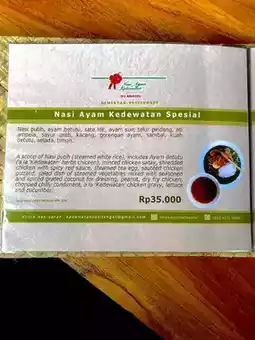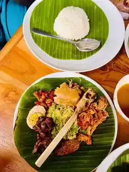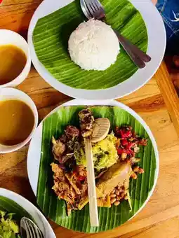 伊布·芒库鸡饭(Kedewatan Ibu Mangku Chicken Rice)是巴厘岛的特色美食,以鸡肉饭搭配巴厘岛特有的香料制成。这道菜由伊布·芒库(Ibu Mangku)创制,自1964年以来一直是巴厘岛的热门美食。
