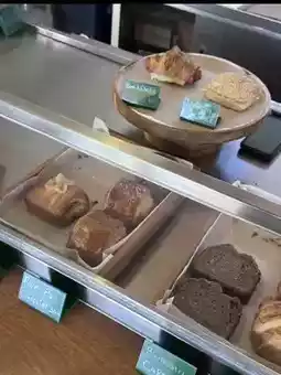 架子上摆满了各种各样的糕点,看起来都非常诱人。我点了一个杏仁牛角包和一杯拿铁。牛角包外皮酥脆,内里松软,杏仁馅料也很足,吃起来很满足。拿铁也很好喝。☕️