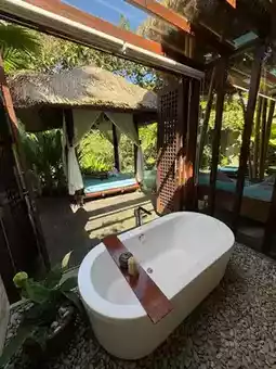 Om Swastiastu Aksari。我们通过Trip-a-Deal预订的三晚住宿体验非凡。我们预订了一栋带私人泳池的别墅,从抵达的那一刻起就感受到了皇室般的待遇。工作人员确保每个细节都完美无瑕。别墅拥有一个美轮美奂的泳池、一张舒适的床、一个宽敞的浴室和一个户外浴缸。早餐丰盛美味,自助餐种类繁多。晚餐是从精选菜单中选择,但每一道菜都令人愉悦。我强烈推荐鸡翅作为开胃菜。无限畅饮的鸡尾酒时光和下午茶令人无比享受。健身房虽然不大,但设施齐全;每次去都感觉很安静。晨间瑜伽课程令人愉悦,水疗中心更是妙不可言——这是我多年来体验过的最佳按摩之一。特别感谢Lina、Wulan、Komang、Santi、Billy和Awan提供的卓越服务。度假村安全、干净、私密,入住体验令人愉悦。感谢如此美好的住宿体验。