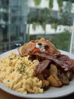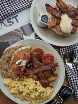 他们招牌的烤肉早餐同样令人印象深刻——丰盛的菜肴既温暖人心又令人满足。炒蛋口感绵密浓郁,火候恰到好处,呈现出柔滑如蛋奶冻般的质地。酸面包吐司外皮酥脆金黄,内里柔软蓬松,完美地吸收了烤番茄和炒蘑菇的汁水。培根酥脆入味,香肠鲜嫩多汁,调味恰到好处,所有食材完美融合,成就了一顿令人满足却又不油腻的早餐。