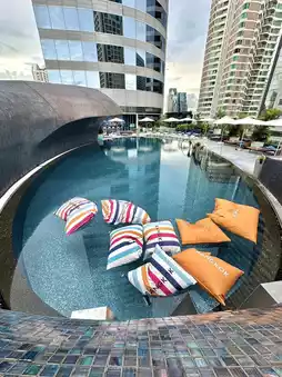 曼谷W酒店的室外泳池里有很多适合拍照的漂浮床,