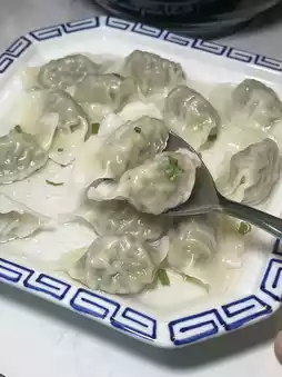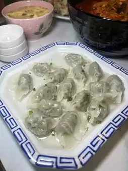 汤饺(120韩元),馅料丰富的猪肉小饺,浸在略微浓稠的汤汁中,鲜美可口。