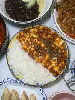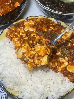 麻婆豆腐拌饭 (300) 麻婆豆腐拌饭,米饭配以辣酱炒嫩豆腐和猪肉。
