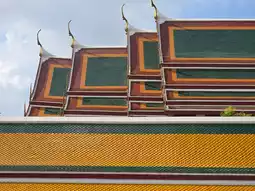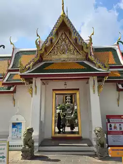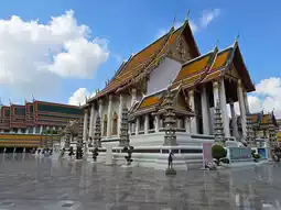 素泰寺建于19世纪上半叶,是曼谷最重要的仍在使用的寺庙。我到访时,主殿正举行慈善活动,人潮涌动,既热闹又略显拥挤。寺内供奉的素可泰风格镀金佛像可追溯至14世纪,而精美的壁画则创作于19世纪。主殿后方是同样引人入胜的戒堂,其中矗立着1847年的大型佛像,对面是约80位弟子的雕像。描绘佛陀不同化身的壁画堪称泰国艺术的巅峰之作。虽然不对游客开放,但可以参观僧侣的起居区。如果只能在皇宫之外参观一座寺庙,素泰寺无疑是最佳之选。