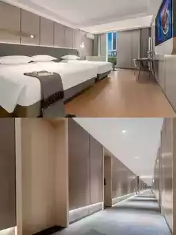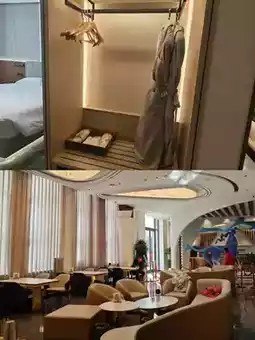 酒店内部装潢现代简约,令人印象深刻。大堂宽敞明亮,挑高的天花板和艺术感十足的吊灯营造出奢华的氛围。休息区温馨舒适,柔软的沙发和绿植营造出轻松惬意的氛围。🛏