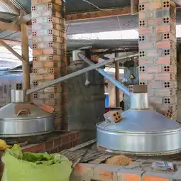 乘坐三轮车,探寻马德望当地村民的糯米酿酒技艺。这里的酿酒过程并不复杂,耗时也不长。酿酒设备看起来品质上乘,干净卫生,安全可靠。来到这里,一定要尝尝这里的米酒。这里有水果酒,还有用蛇腌制的米酒,蛇就像草药一样,据说可以增强体力,强身健体。这里的米酒最高温度在40-50度左右。