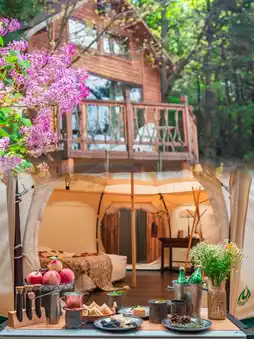 树屋内部同样匠心独运——温暖的天然木材与现代设计完美融合。落地窗将山峦四季的变幻尽收眼底。清晨,薄雾般的阳光透过树叶洒下,鸟儿婉转啼鸣;夜晚,繁星点点,树叶沙沙作响,伴您安然入眠。智能化的设施、优质的寝具和优雅的浴室,确保您在野外也能享受舒适惬意。