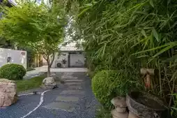 庭院虽小却层次丰富——竹影摇曳,流水潺潺,宛如闹市中的一片隐秘山林。