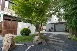 推开木门,脚下是一条铺着碎石的小路,石缝间长着青苔,几块石头和一棵枫树静静地伫立在庭院中央。