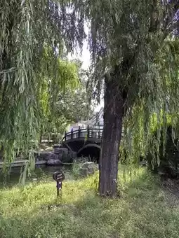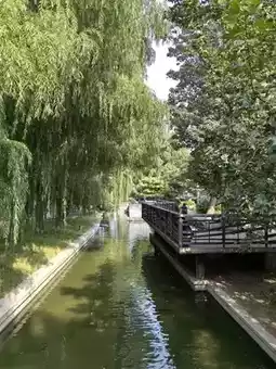 走进公园,首先映入眼帘的是绿树成荫和潺潺流水。柳树枝繁叶茂,垂至水面。微风吹拂,树叶摇曳,在水面上泛起阵阵涟漪。一座木桥横跨江面,踏上桥面,能听到脚下轻微的吱呀声。桥边立着一块牌子,上面写着“京杭大运河豫河段”,提醒着游客这段河道的重要性。水不深,可以看到水生植物,偶尔还能看到小鱼静静地游过。