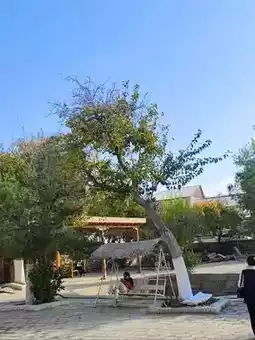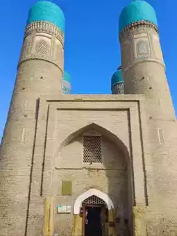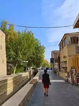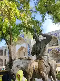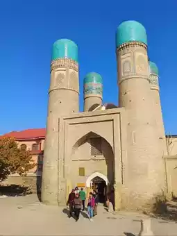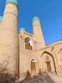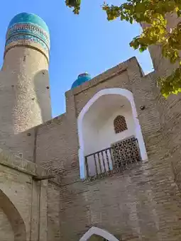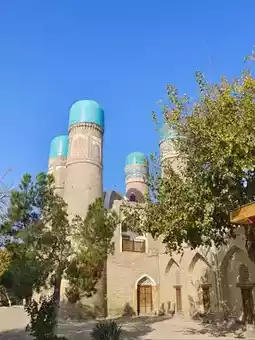 清晨7点,我独自一人欣赏着这座如梦似幻的蓝色圆顶塔楼!四座装饰着波斯图案的宣礼塔在晨光中熠熠生辉。隐藏的宝藏:前往后巷,透过拱门将塔楼框入画面,拍出足以登上《孤独星球》的照片。一位当地的刺绣匠人送给我一条石榴图案的围巾,并说道:“蓝色是布哈拉写给天空的情书。” 💙