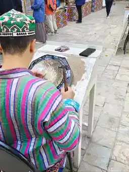隐藏的宝藏:**丝绸地毯工坊**,金线在这里编织出神奇的魔法。一位老工匠演示了如何抛掷地毯,让瓷碗稳稳地放在上面——这证明“飞毯”的传说就起源于此!