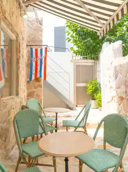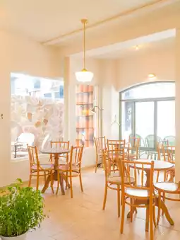 明亮的室内装潢,阳光透过大窗户洒满店内,
