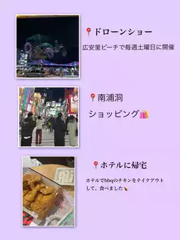 搭乘地铁🚇至凡一站📍在Connect Hyundai购物🛍️ ↓12:00〜步行5分钟🚶至元正河畔餐厅午餐🐙 ↓13:00〜搭乘地铁🚇至凡一站至金莲山站📍在广安里海滩漫步🏖️ ↓14:00〜 步行5分钟📍在海景咖啡馆小憩🍰 ↓15:30〜 步行10-15分钟🚶至广安里漫步!逛逛各式各样的商店!↓ 出发(步行15分钟🚶)17:00 📍 在美乐扎市场稍作休息↓ 出发(步行10-15分钟🚶)18:30 📍 在东明植面享用晚餐 并 观看无人机表演↓ 出发(从地铁🚇广安里站步行15分钟至南浦洞站)20:00 📍 在南浦洞购物🛍️ ↓ 出发(从地铁🚇南浦洞站乘坐地铁🚇至酒店附近车站)22:00 📍 在酒店附近的烧烤店购买烤鸡🍗 ↓ 出发,短途步行22:30 📍 抵达酒店🏨 #釜山之旅#釜山旅行