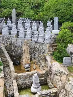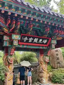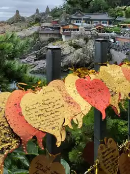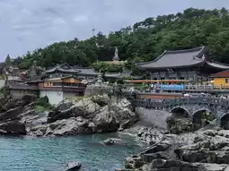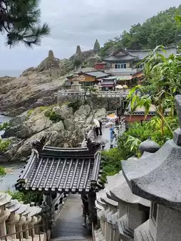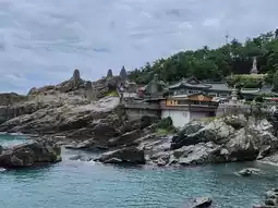 Haedong Yonggungsa Temple is one of Korea's three major sites dedicated to the Goddess of Mercy. It combines elements of the sea, dragons, and the Great Buddha of Mercy, making it a popular attraction in Busan. Even on a rainy day, there were still many Western tourists visiting.