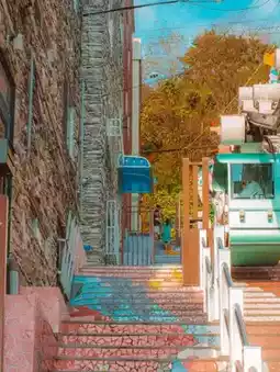 • 阶梯旁建有单轨/缆车式车厢(薄荷绿色),方便人们(尤其是老年居民)避免攀爬所有台阶。如有居民或需要帮助的人,则优先乘坐。空闲时,游客也可乘坐。