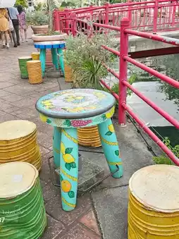 别致的艺术装饰,例如绘有水果图案的桌椅,为街道增添了一抹亮丽的色彩。🧢