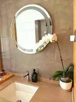 浴室细节:一面优雅的圆形镜子,点缀着兰花;一个原木收纳架和一个木桶——是拍摄日式禅意照片的理想之选。就连你的晨间洗漱都像是一次充满美感的入住体验~