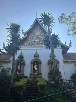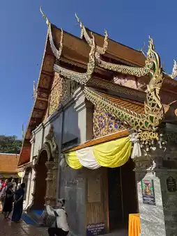 到达后,您可以选择乘坐缆车(20 泰铢)或攀登 306 级那伽台阶——每条路都通往一片宁静祥和的金色净土。在寺庙内,您可以欣赏金碧辉煌的佛塔,聆听僧侣们轻柔的诵经声,并饱览下方清迈的全景。🕰️