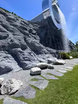 This cafe is all about taking photos and striking beautiful poses, as the view is truly breathtaking. 🌲 The entrance to the shop looks like a spaceship. Upon entering, you'll be greeted by a door that looks like you're boarding a spaceship. Upon passing through, you'll be greeted by a view of the shop: green grass, cliffs, and crystal-clear water. It's a dug-out pond and a red clay rock pool. This is a stunning natural viewpoint, offering a 180-degree view of the Grand Canyon.