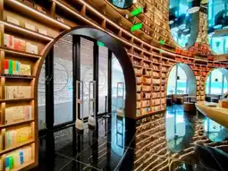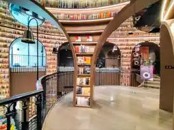 图书馆藏书约8万至10万册。除了阅览区,这里还有儿童阅览区、阅览长廊和精品阅览区。整齐排列的书架如同拱门般水平对称,镜面地板倒映着书架,宛如一条书海隧道。沿着长廊走下去,仿佛置身于无尽的书海之中。