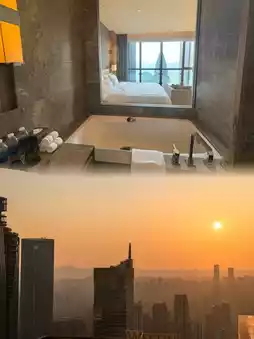 屋顶无边泳池漂浮在250米高空☁️——在这里游泳仿佛置身于电影《疯狂石头》的场景之中!🎬 儿童区设有AR游戏,孩子们可以“画”穿梭于建筑物间的轻轨🎮,还有令人上瘾的虚拟叠山游戏!🏞️ 隐藏福利:房卡持有者可免费享受长江索道VIP通道!🚠 夜晚,酒吧供应“山城辣妹”鸡尾酒🍸,搭配可食用四川小吃。底部有花椒~🌶️
