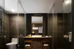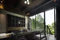 ☀,在木质茶室里沏上一壶茶🍵,欣赏窗外郁郁葱葱的景色,时间仿佛在此慢了下来。就连浴室也散发着优雅的气息,黑色瓷砖、白色陶瓷和木雕,处处体现着对细节的精雕细琢✨。