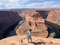之前只是听说过的马蹄湾,亲眼见到之后真是美得令人窒息!正如它的名字一样,雄伟的马蹄形峡谷在你眼前徐徐展开,红色砂岩与科罗拉多河交相辉映,美得令人窒息!美中不足的是,拍照点没有安全围栏。😦 我不知道现在是否已经安装了,但我感觉围栏绝对是必要的。大自然总是如此令人敬畏!👍