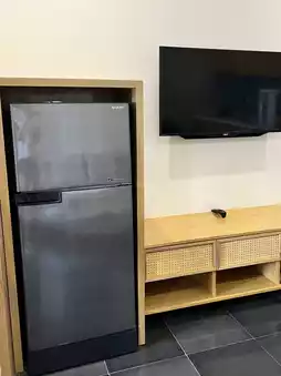 房间装修现代,配备齐全,包括厨房、厨具、冰箱和洗衣机!