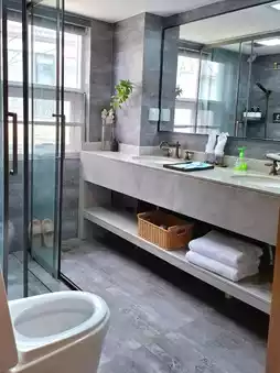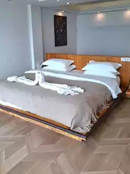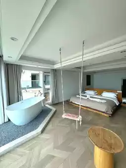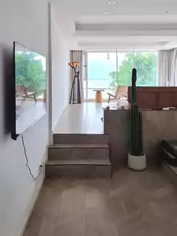 我们入住的是一间宽敞的复式客房,下层设有舒适的休息区和电视区,上层则是床铺。房间的