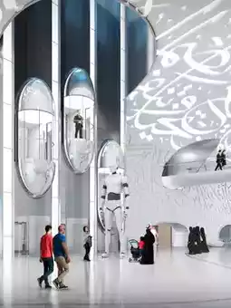 • 未来主义设计 🏙️ – 独特的环形建筑,外立面雕刻着阿拉伯书法。
