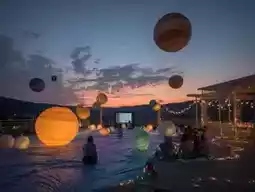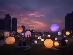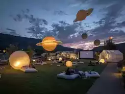 夜幕降临,真正的魔法开始上演——草坪上散落着各种行星形状的充气薄膜缓缓亮起。土星及其光环、橙红色的火星、以及布满环形山的月球……